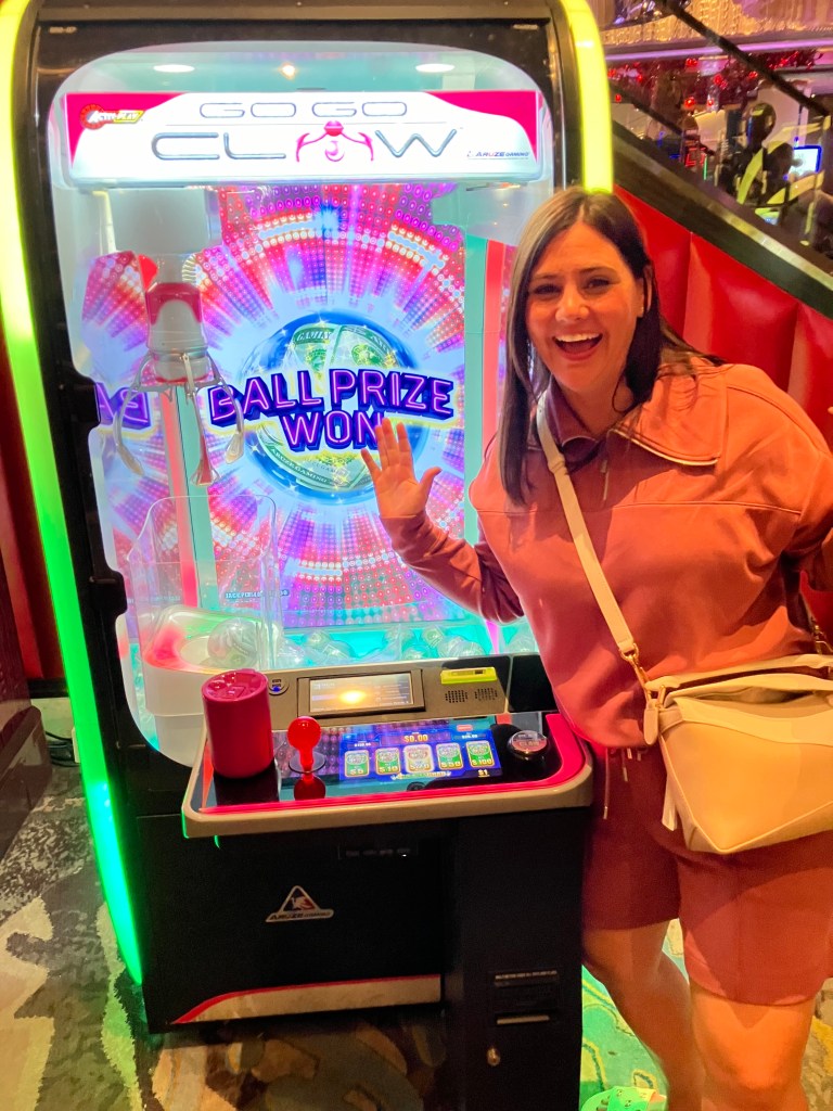 We had our dinner date at Giada – we taxi there and walk home – which we were both looking forward to because we’ve skipped Giada the past couple times. We knew we wanted to share a few dishes and had decided earlier in the day that we would order the bread board, the romaine salad, and the rigatoni veggie pasta. The hostess let us know it would be a few minutes for our table and to head into the lounge and grab a drink. We paid and got our drinks at the bar lounge when the hostess led us to our table. It was a nice table, we could see out the window towards the Bellagio fountains without having paid the additional $25 per person to have a window seat. It seemed our waiter was annoyed or upset that we already had drinks and he whisked away our wine glasses (even though I typically order a nice glass of wine there after my one cocktail) snipping that he guesses we won’t be needing those or the wine menu. We later asked for the wine menu again and he dropped it on the ledge for us, saying nothing. We ordered what we wanted and he quipped that the pasta is only 6 ounces and we should order more and we said that’s fine with us, we only want to share these items. We never saw him again until well after we finished eating and I managed to get his attention and asked for the bill. We never got asked if we wanted another drink, if we needed anything else, if the food was good… it was very odd. We wanted another drink, possibly a dessert but instead we just paid and left. I said we should head across to Spago and have a drink. Spago was more than welcoming, we sat at the bar, watched a bit of the US Open and enjoyed a cocktail together. An older gentleman came and sat in the barstool next to me even though there was nobody else at the bar at the time, and he swiftly started chatting up the bartenders who you could tell knew him. They kept calling him the politician, and he kept asking them what time their shift was over and to come hang out with him after. They kept their answers vague but did mention that another regular customer comes in and buys them matching Gucci bags (!!!) and Gucci was still open…. the man was very persistent and I was impressed on how these two lady bartenders handled it. One of them saw my little black Gucci bag and she said “see – go buy us that one and then we might hang out with you after our shift!” On our receipt I wrote to them “get that Gucci girl!!” They were really nice. We went back to the room, changed into more comfy clothes and gambled a little before heading up for sleep. I played the claw machine and unbelievably I won $100 ball!