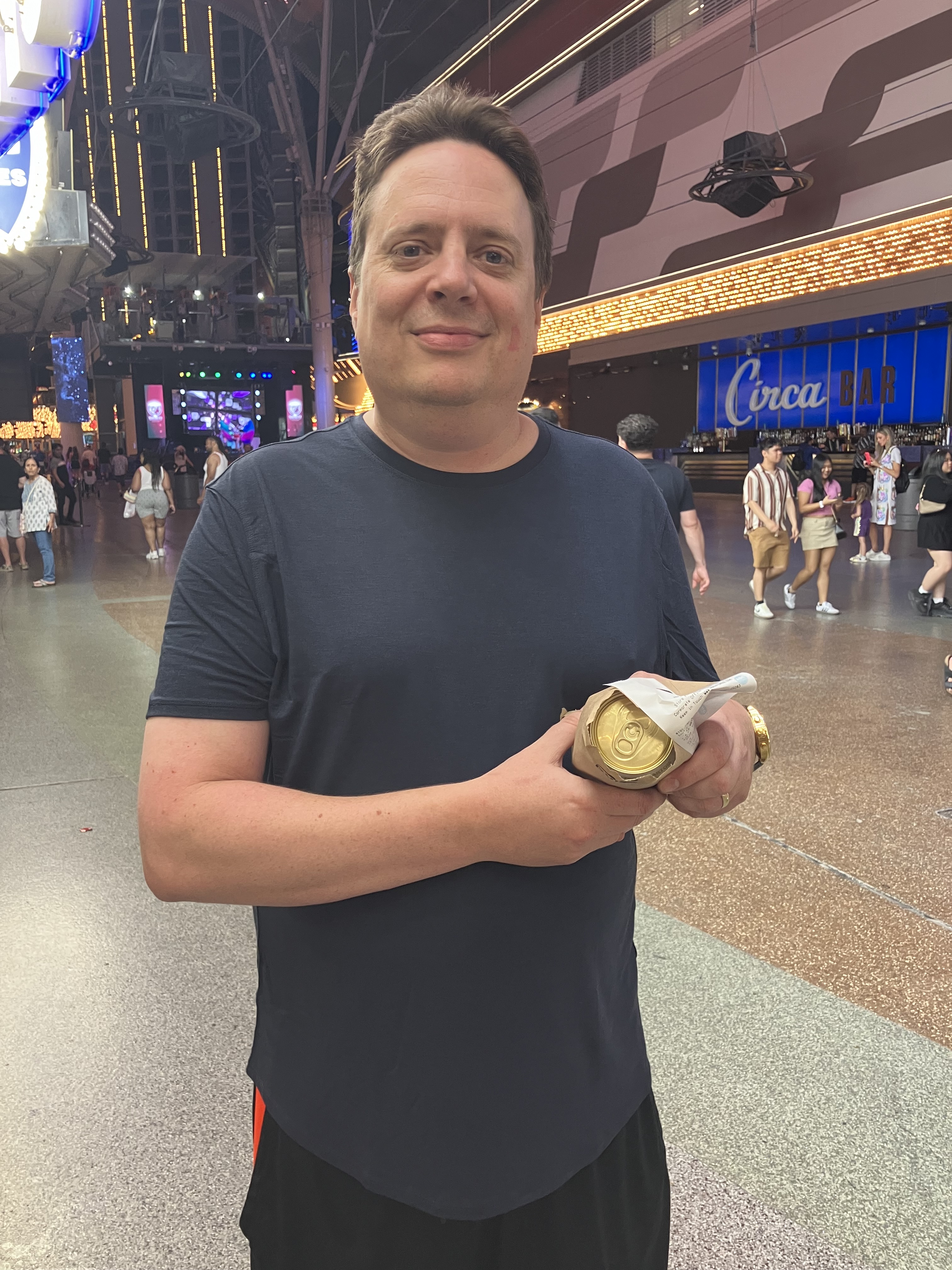 We planned on having breakfast today at Monami Gabi at the Paris Hotel. We got there near 11am, and were sat at a table inside. The place was empty on the inside but people were out on the patio. Beside us was an older couple, and the lady would/could not stop coughing. We noticed the lunch menus had no breakfast items and Christopher really wanted breakfast food so we were going to ask the waiter about it but instead asked the water man. He said he didn’t know and to ask the waiter. We sat for 8min or so before the water man appeared and I felt uneasy about staying, like it wouldn’t be a good/fun lunch together, we could only hear the lady coughing and hadn’t seen the waiter yet after almost 15min so we made the decision to leave. We walked back to the Cosmo and went to the Henry and it was fantastic! Our waiter there was so nice and funny. We enjoyed coffee and Christopher got his breakfast items, I ate a grilled cheese and it was perfect. That afternoon we walked over to Eataly to check it out while we weren’t so tired. We bought some coffee to bring home plus some saffron spaghetti. I asked if Chris wanted to go to Old Vegas before dinner but he said he would prefer after dinner so that’s what we did. Our dinner date was at Tom Colicchio’s Craftsteak at the MGM and we also had to check-in to our room there before dinner. We headed over around 5pm and planned to check-in and gamble a little before our dinner. When we got there, they said our room wasn’t ready yet, but they were rushing a housekeeping team up there for us and gave us $100 dining credit for the inconvenience. That gave us $200 worth of dining credits because we already had $100 offered through our booking with $60 of freeplay. The room was ready 30min later. We went up there, dropped off our bag that had a change of clothes in it for after dinner and then headed to eat. The food was so good. We ordered the fries, and they came with some cajun spice maybe on them and they gave us individual mini heinz glass ketchup bottles. The drinks were superb. We ordered the honey roasted carrots which were heirloom and divine. I had the halibut and Chris ordered the prime rib. We were so full. We couldn’t do dessert. We charged to our MGM room and then changed, went downstairs to take a taxi to Old Vegas. We found a Whitney Houston slot machine and other fun machines and walked around for a few hours. We finished on a Goonies slot machine. We didn’t win any money but had so much fun. Christopher’s favourite part of Old Vegas is buying a big beer from the ABC store and having the cashier wrap it in a paper bag, staple it shut, and give the disclaimer that you can’t drink it outside while walking.